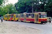 Поезд из вагонов "Татра" Т6Б5 номер 14 и 13 (депо N 1) на улице Октябрьской.