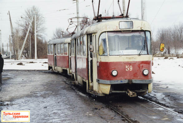 Поезд из вагонов "Татра" Т-3 номер 59 и 60 (депо N 1) на линейной станции "Менделеевский поселок".