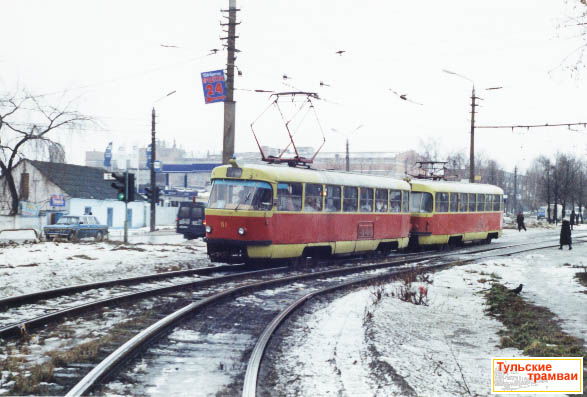 Поезд из вагонов "Татра" Т-3 номер 61 и 62 (депо N 1) на Одоевском шоссе в Мяснове.