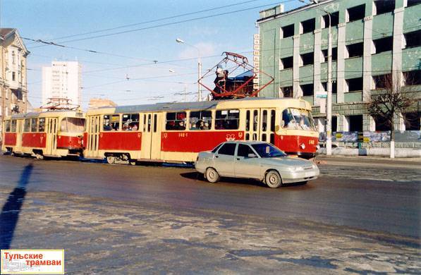 Поезд из вагонов "Татра" Т-3 номер 140 и 141 (депо N 1) на ул. Советской.