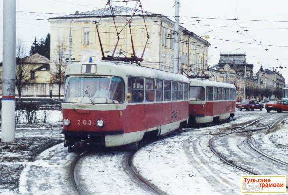 Поезд из вагонов "Татра" Т-3 номер 243 и 244 (депо N 2) на улице Советской.