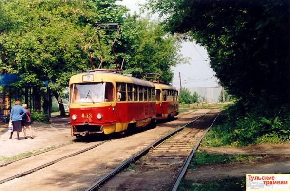 Поезд из вагонов "Татра" Т-3 номер 413 и 414 (депо N 2) на ост. "Ул. Кутузова".