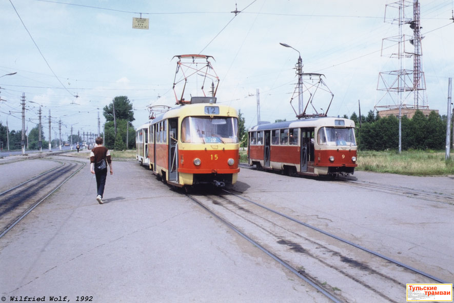 Поезд из вагонов "Татра" Т-3 номер 15 и 16 (депо N 1) на линейной станции "Менделеевский поселок".