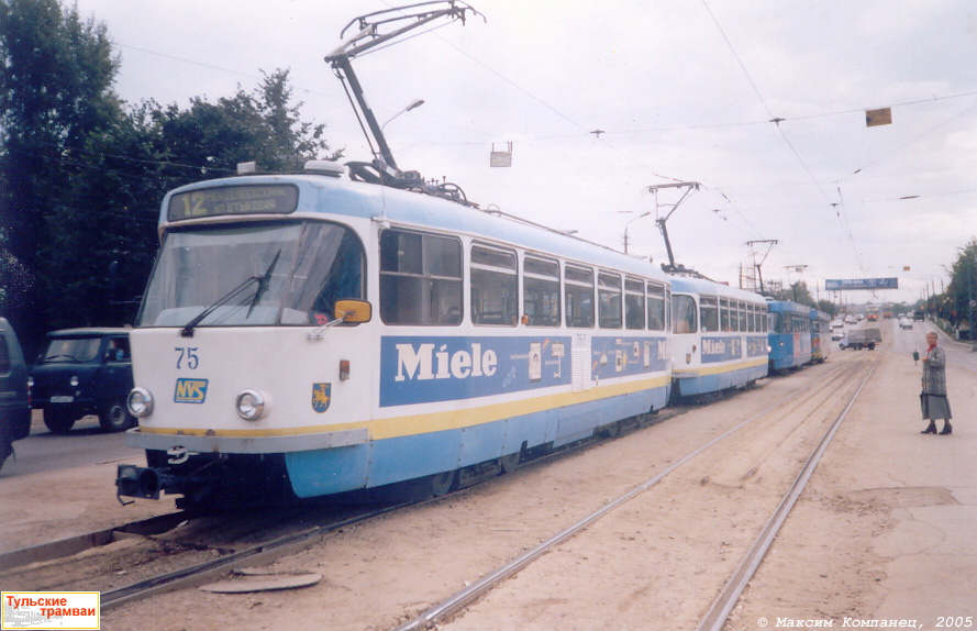 Поезд из вагонов "Татра" Т-3D номер 75 и 76 (депо N 1) на остановке "Улица Пролетарская"