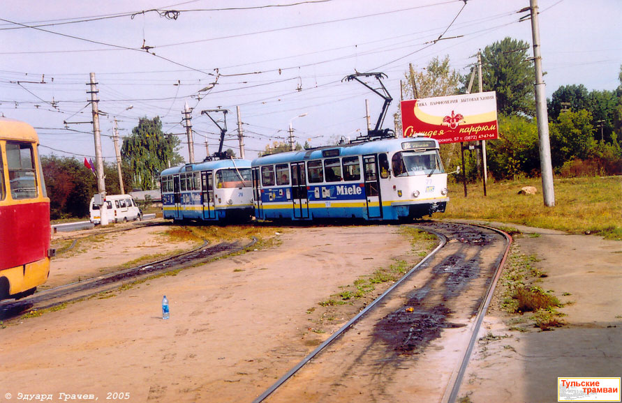 Поезд из вагонов "Татра" Т-3D номер 77 и 78 (депо N 1) на линейной станции "Менделеевский поселок"