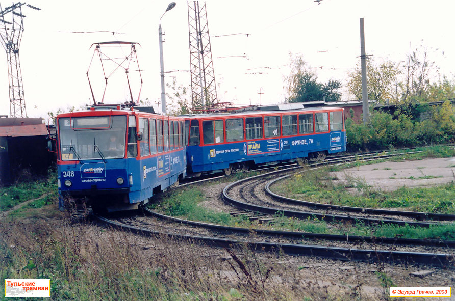 Поезд из вагонов "Татра" Т6Б5 номер 348 и 349 (депо № 2) на линейной станции "Стадион "Металлург"